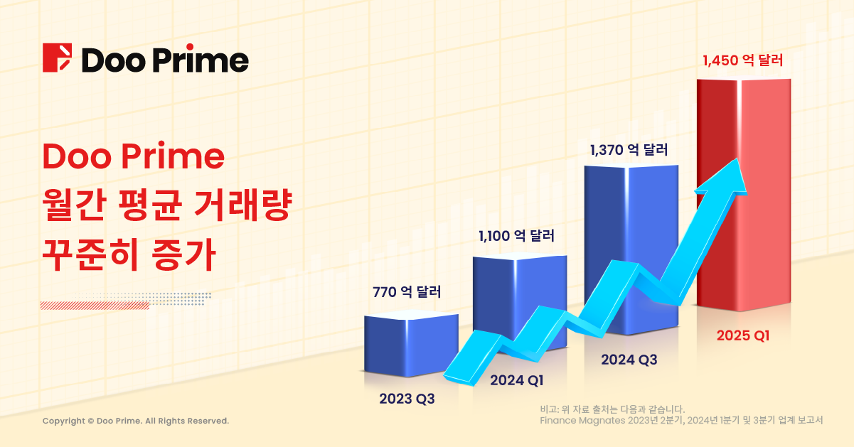 또한, Doo Prime의 2025년 1분기 월 평균 거래량은 1,450억 달러에 달하며 이는 2024년 3분기의 1,370억 달러 대비 약 5.8% 증가한 수치입니다. 이러한 다차원적인 데이터는 글로벌 자본 흐름이 가속화되는 시장 환경 속에서도 Doo Prime이 탁월한 글로벌 거래 서비스 역량을 바탕으로 전 세계 트레이더들로부터 지속적인 신뢰와 가치를 인정받고 있음을 보여줍니다. 이로써 Doo Prime의 브랜드 국제 영향력은 더욱 가속화되어 확장되고 있습니다.