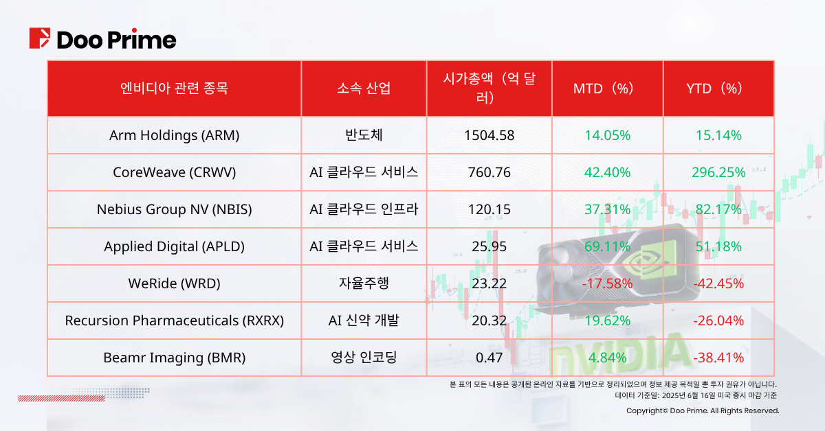 2025년에 접어든 지금, AI 기술은 이미 일상생활의 많은 부분을 근본적으로 변화시키고 있습니다. 업계는 끊임없이 진화하고 있으며 새로운 기술과 스토리라인이 잇따라 등장하고 시장의 투자 포인트 또한 빠르게 순환하고 있습니다. 엔비디아 CEO Jensen Huang의 예측은 과연 현실이 될까요? 현재 엔비디아가 투자한 AI 기업들은 과연 먼저 상용화에 성공하며 새로운 성장 주기를 이끌 수 있을까요?더 많은 AI 투자 인사이트를 찾는 여정에서 D Prime은 전문적인 시각으로 시장의 흐름을 함께 읽어가며 주요 트렌드에 발맞춰 나갈 수 있도록 돕습니다. 또한, 시장 변화에 유연하게 대응하고 포지션을 효과적으로 관리할 수 있도록 지원합니다.D Prime의 실전 매뉴얼 콘텐츠를 통해 최신 시장 이슈와 투자 전략을 확인해 보세요. 더 많은 기회를 선점하는 데 도움이 될 것입니다!