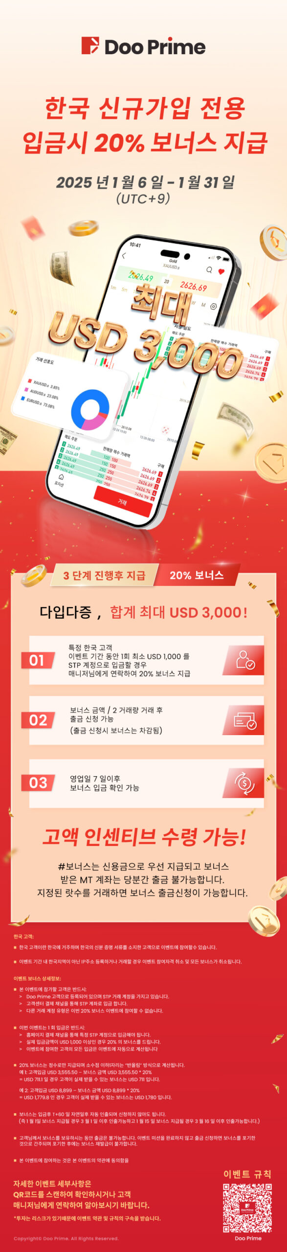 이번 이벤트는 낮은 참여 조건과 높은 보너스 혜택을 제공하는 특별한 기회로 여러번의 입금을 통해 더 많은 보너스를 획득할 수 있습니다. 최대 USD 3,000의 보너스를 통해 거래에서 더 큰 이점을 누릴 수 있도록 지원합니다.