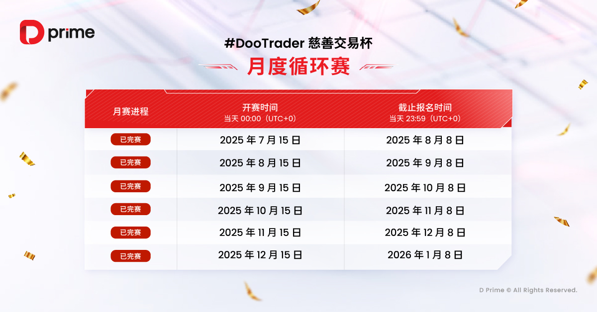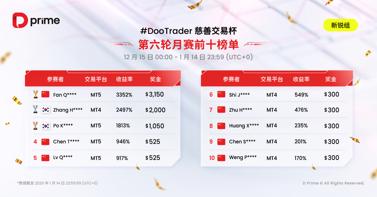 2025년 D Prime #DooTrader 자선 트레이딩 제5라운드 월간 대회가 12월 14일 23:59(UTC+0) 기준으로 성공적으로 마무리되었으며 뜨거운 관심 속에 대회 결과 랭킹이 공식 발표되었습니다!