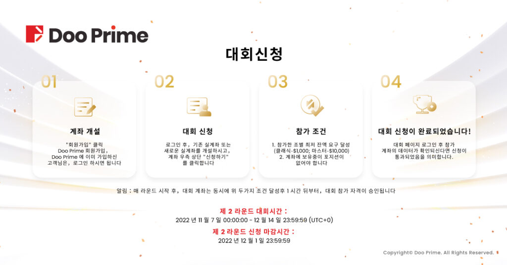 2라운드 대회는 2022년11월7일 00:00:00 – 2022년12월14일 23:59:59까지 입니다. 1라운드에 참가하셨던 거래자 또는 새로운 참가자 모두 대회에 참가하실 수 있습니다. 제2라운드 대회의 마지막 신청시간은 2022년12월1일 23:59:59까지 이고 여러분들의 많은 참여 바랍니다.