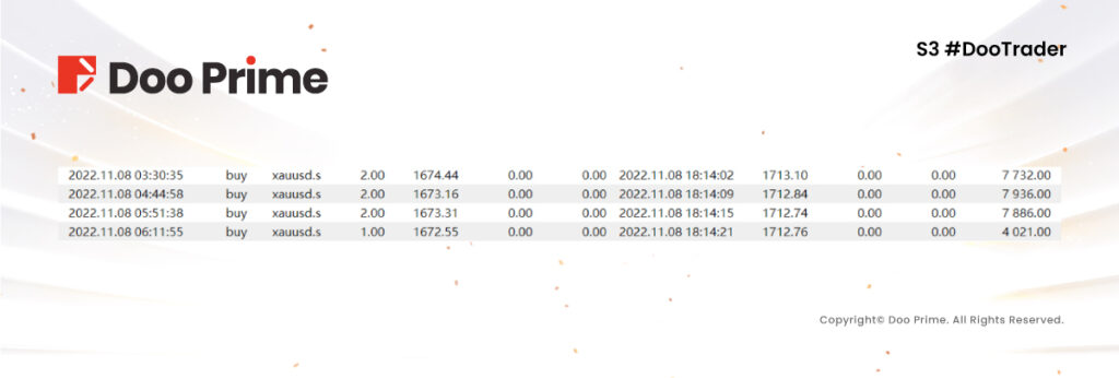 이후 11월 7일부터 11월 8일까지 XAUUSD의 전반적인 시세가 소폭 변동함에 따라 Xue YanqXXX의 거래는 인내심과 신중함에 치우쳤으나 11월 8일 XAUUSD가 빠르게 상승하여 진폭 구간을 돌파함에 따라 Xue YanqXXX는 즉시 거래포지션을 2-10으로 확대하여 양일간 5,000+의 수익을 올렸습니다.