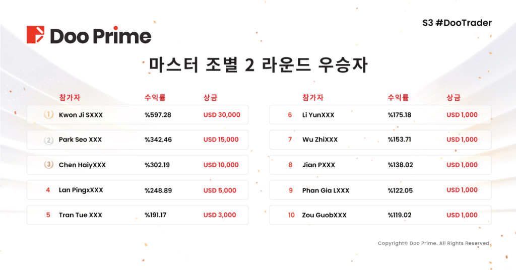 올해 대회를 놓쳐도 아쉬울 것 없이 내년 새 대회를 기대하며 Doo Prime은 더 나은 대회와 풍성한 보너스로 새로운 거래의 기적을 만들어 낼 수 있을 것입니다. 또한, Doo Prime은 S3 #DooTrader 트레이딩 대회 우수선수 인터뷰를 순차적으로 업로드 할 예정이오니 투자 고수 여러분께서 온라인상에서 승리에 대한 비법을 공유해 주시고 계속하여 멋진 모습을 보여드릴 예정이니 많은 기대 부탁드립니다!