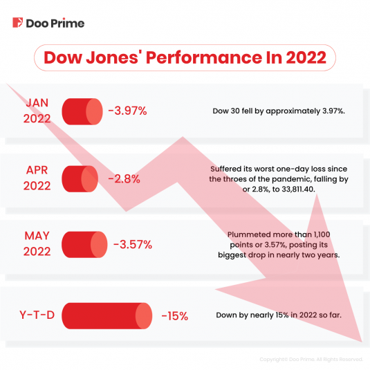 That said, Dow Jones coupled with S&P 500’s biggest one-day loss since June 2020. At this point, the Dow is down by nearly 15% in 2022 so far.