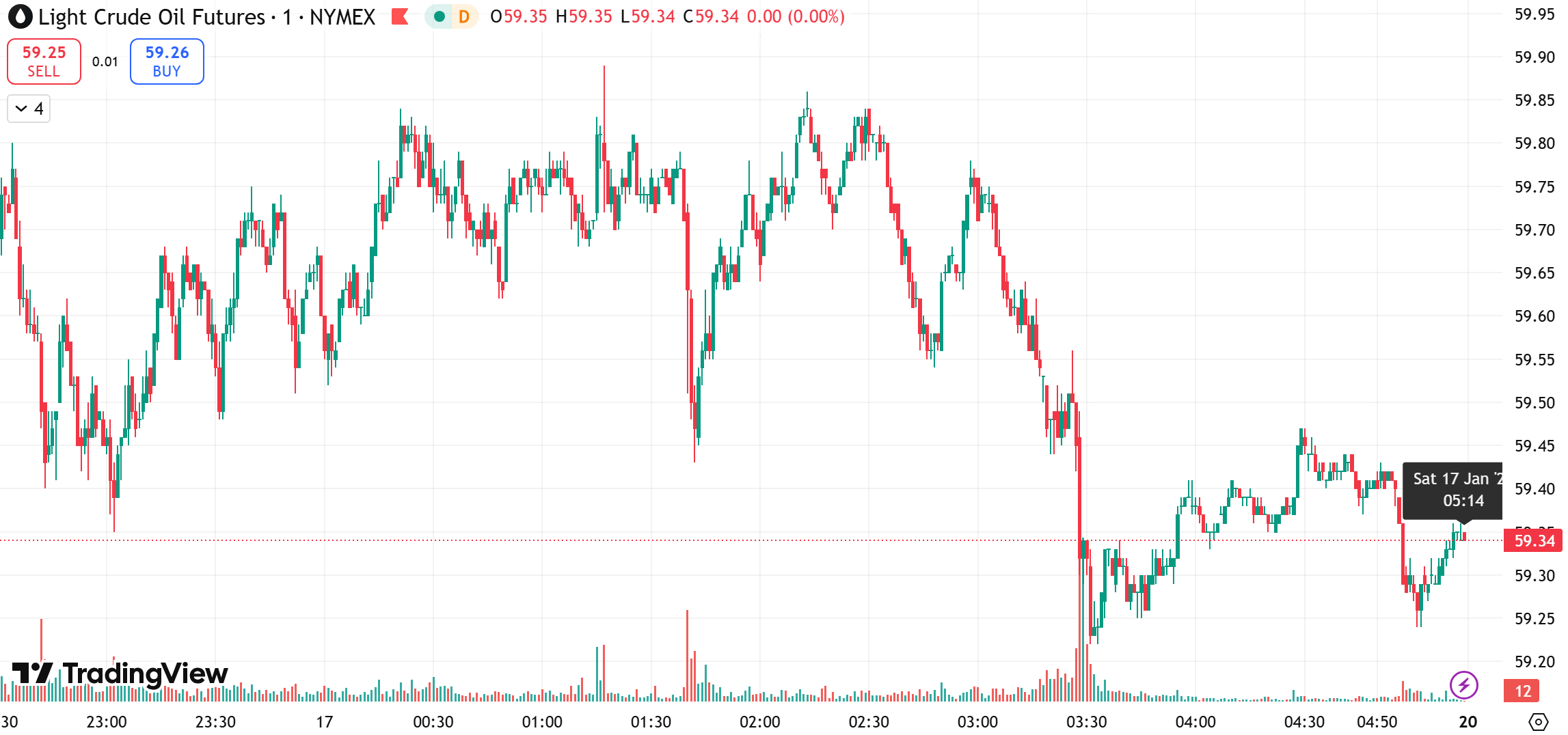 Meanwhile, WTI crude oil hovered around $59.36/barrel, holding largely steady. With domestic unrest in Iran easing, fears of U.S. military action against the major oil producer diminished, shifting market focus toward escalating U.S.-Europe trade tensions that could impact global demand.