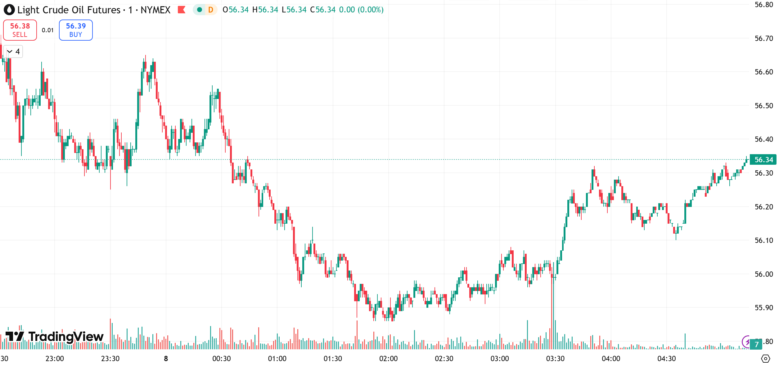 From a daily chart perspective, oil remains capped by a bearish moving average structure, with medium-term trend direction still pointing lower. On the hourly chart, prices briefly rallied toward $58.85 before reversing sharply, erasing recent gains.
