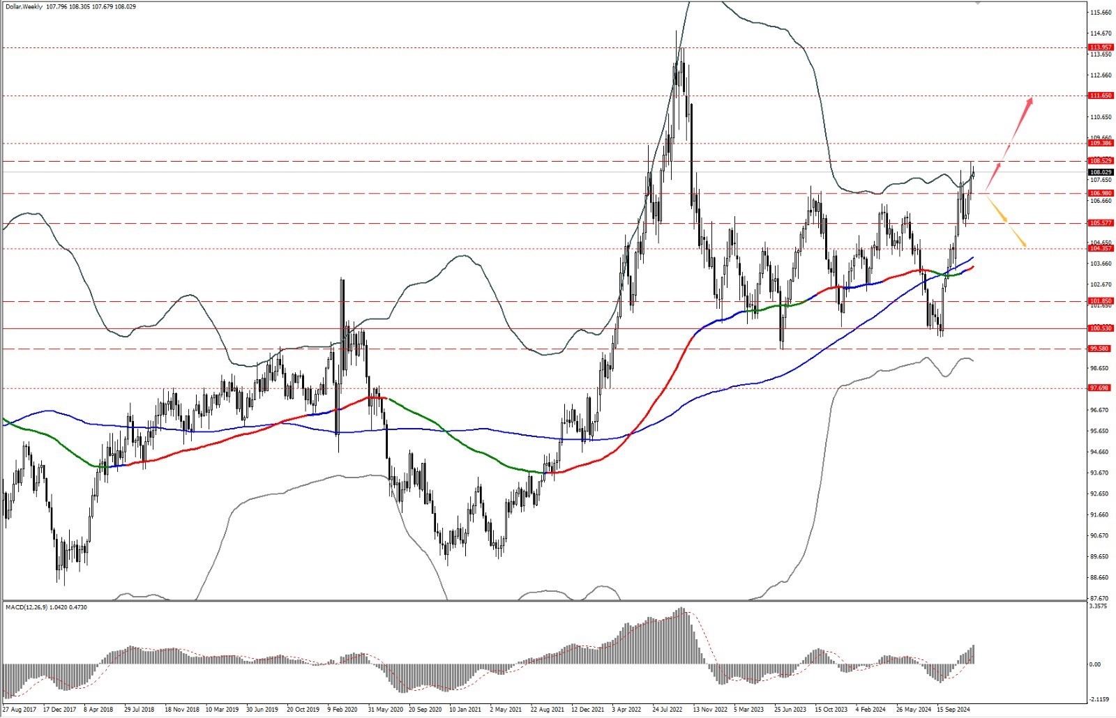 上周,尽管流动性较低,市场的整体情绪依旧看好美元,特别是在美联储近期暗示 2025 年降息步伐放缓后,美元的上行趋势未见明显阻力。从美联储的货币政策来看,虽然市场普遍预期美联储将继续采取较为鹰派的立场,但今年以来美债收益率的上升与通胀持续高位,导致市场对美元的需求依然强劲。特别是特朗普新政府的政策预期,也增加了美元的上涨动力。