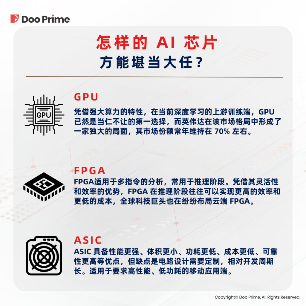 长期来看,无论是 GPU、FPGA 或是 ASIC,这三种技术路线均各有千秋。GPU 的未来无疑会向着更强大、更复杂的算力方向发展。而 FPGA 凭借灵活性的优势,对于应对变化迅速的行业十分适用。而 ASIC 在当前阶段运用较少,却在未来长远来看会十分适用于人工智能行业。因为 ASIC 具备高性能低能耗的特点,可以基于多个人工智能算法展开定制,从而针对不同环境达到最佳的适应性。随着未来进一步发展,ASIC 有望在训练和推理阶段皆能占据一定市场地位。