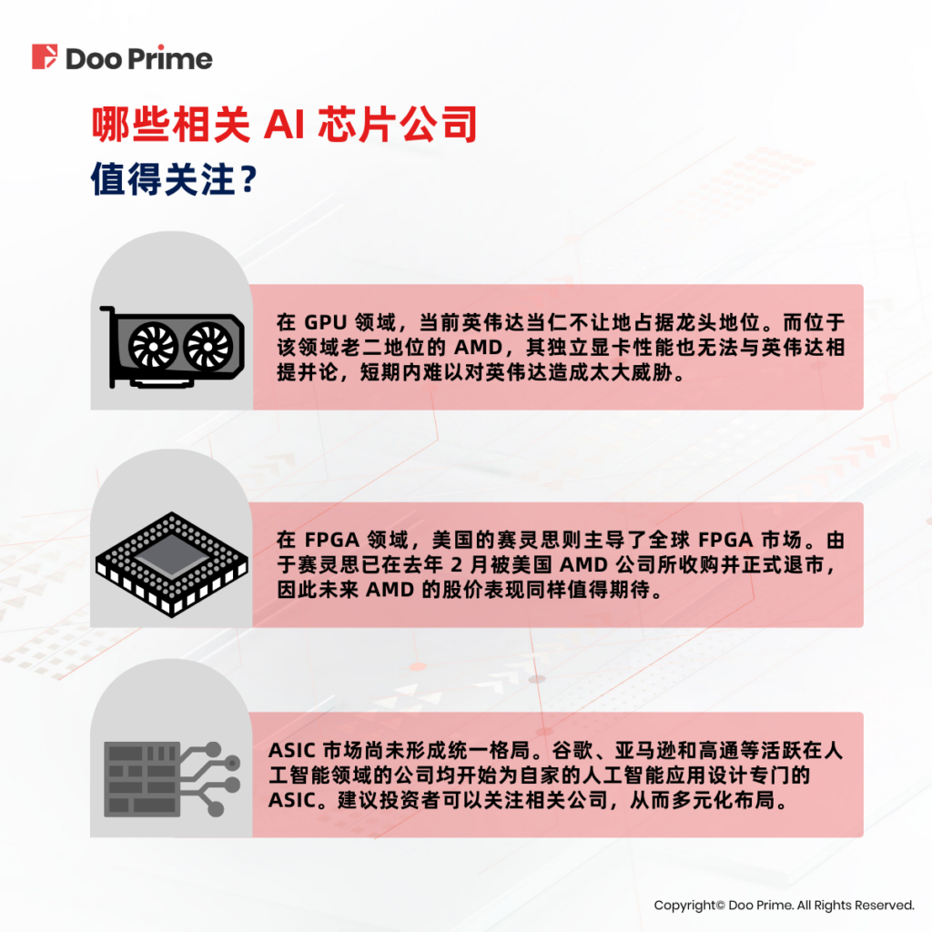 目前来看,相关 AI 芯片公司的股价若想实现短期内的上涨,关键还是得看是否能推出相应的明星级别应用,或者明星级别应用使用了何种类型的芯片。乘着 ChatGPT 的东风,英伟达在市场上被普遍看好自然不必多言。至于其他公司,投资者可以关注下一个能与 ChatGPT 相媲美的应用会采用何家公司的芯片。目前来看,GPU 芯片领域基本已经被英伟达牢牢拿捏,建议投资者可以关注 ASIC 芯片领域的相关公司,多元化布局该领域的相关公司,等待下一个明星级产品的孵化问世。
