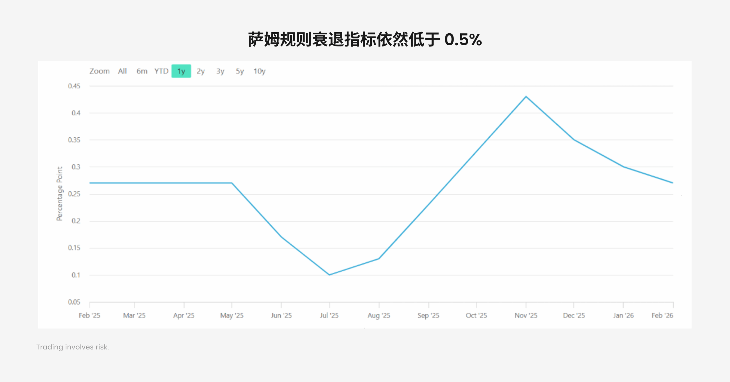 在之前的市场分析中,D Prime 的观点是,由于 AI 引发了新一轮的产能周期,使得美国经济实际上处于扩张期。从最新的数据来看,我们依然维持这样的观点:2 月份,美国 Markit PMI 实际值 51.6,超过预期值 51.2;ISM 制造业 PMI 甚至高达 52.4。再从经典的萨姆规则衰退指标来看,2 月份的指标一直在下降,录得 0.27%,该数值若超过 0.5%,才被视为出现经济衰退。