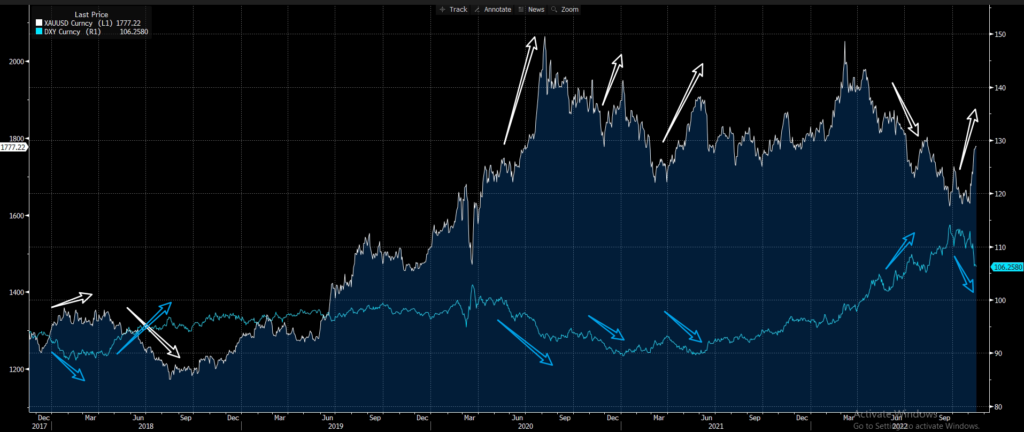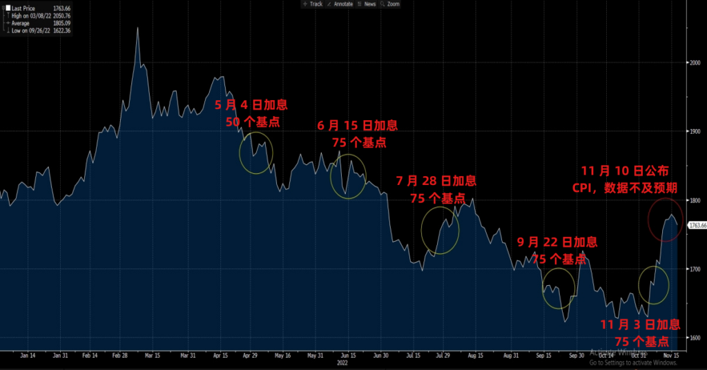 在美元激进加息的通道中,美元价值自然一路飙升。我们通过下图便可看出,今年以来的金价走势基本随着美元升值而逐步走低。但是,11 月 10 日美国最新公布的 CPI 数据不及预期,透露出一股美国当前通胀或已发生好转的曙光。在这一预期下,市场重燃美联储或即将放缓加息步伐的希望,黄金价格又转而走高。