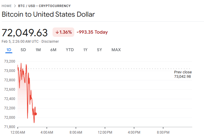比特币价格周三大幅下跌,一度跌破 72,000 美元关口,刷新 15 个月新低,因全球市场避险情绪升温,投资者信心持续恶化。