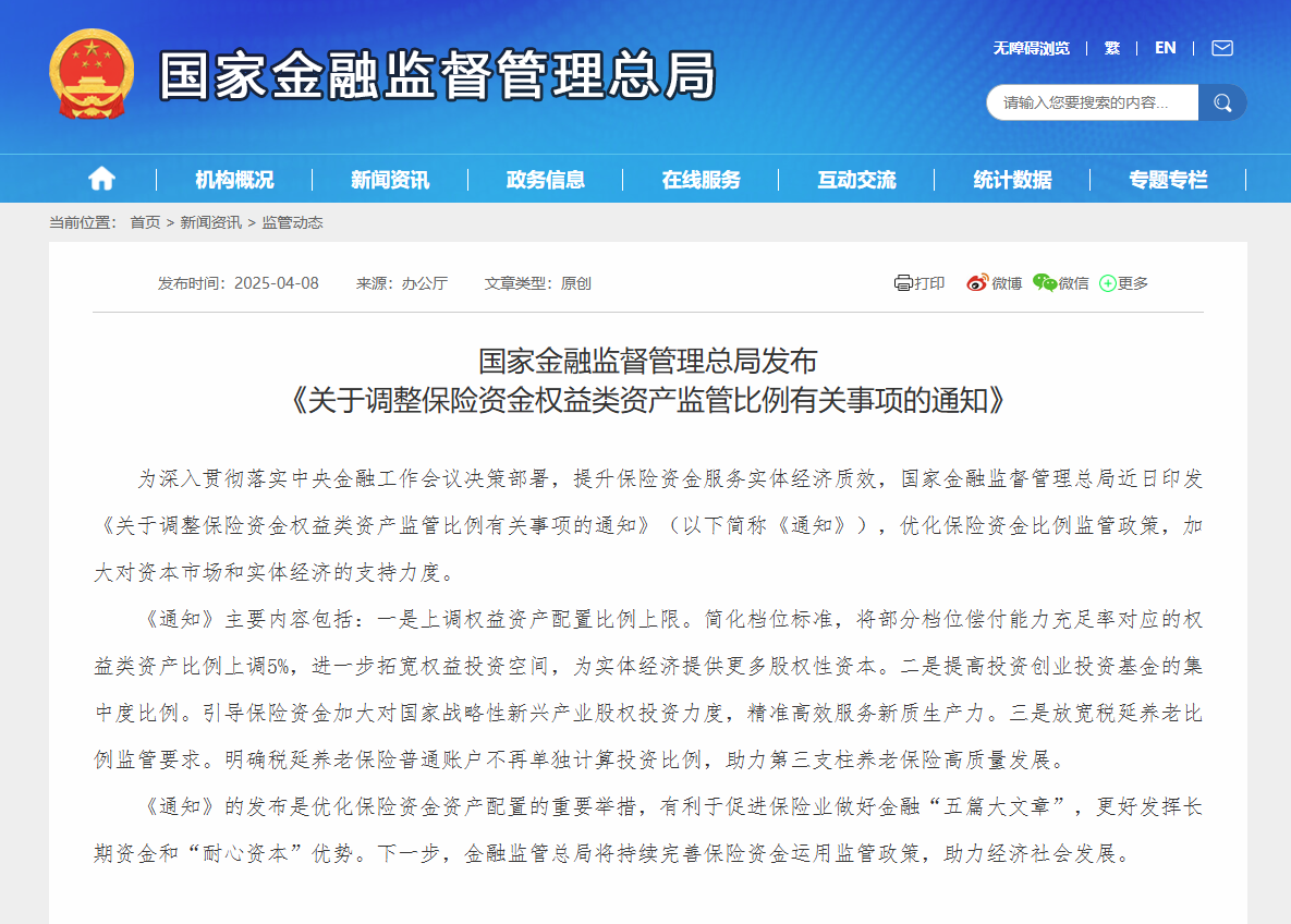 4 月 7 日,国家金融监督管理总局发布《关于调整保险资金权益类资产监管比例有关事项的通知》,优化保险资金比例监管政策,加大对资本市场和实体经济的支持力度。