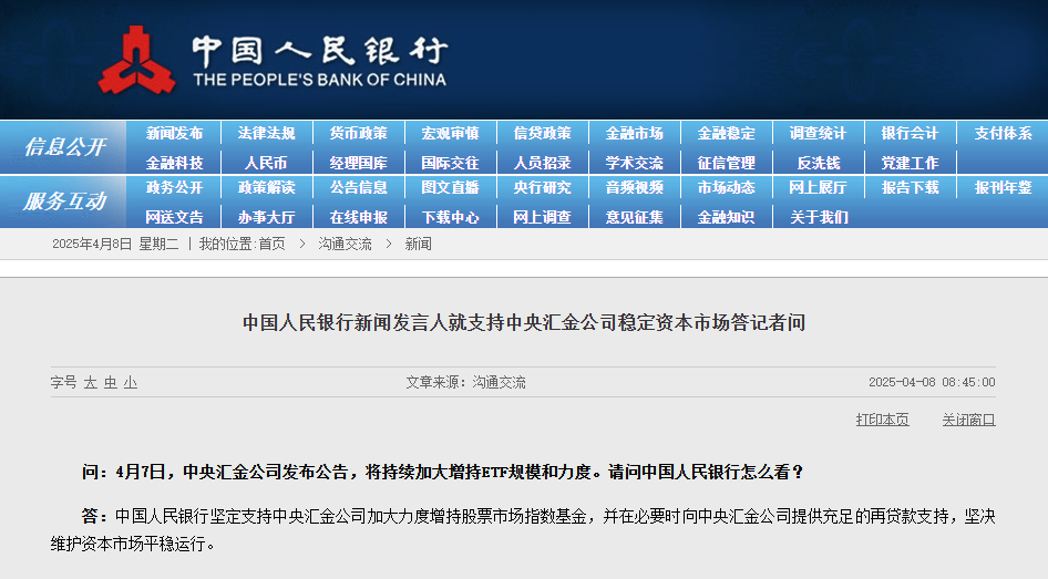 4 月 8 日,中央汇金公司有关负责人就 2025 年 4 月 7 日公告答记者问,重申中央汇金公司将继续发挥好资本市场“稳定器”作用,有效平抑市场异常波动,该出手时将果断出手。下一步,中央汇金公司将坚定增持各类市场风格的ETF,加大增持力度,均衡增持结构。中央汇金公司具有充分信心、足够能力,坚决维护资本市场平稳运行。