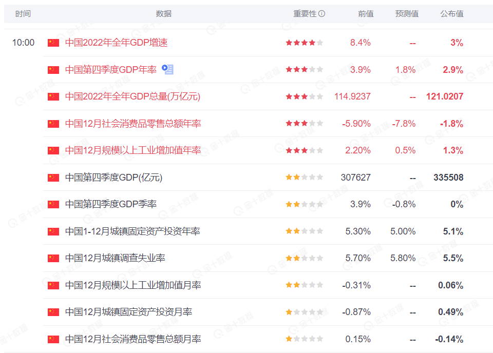 1 月 17 日上午 10 时,中国公布多项重要数据,涉及 GDP、社会消费品零售额、规模以上工业增加值、固定资产投资率与城镇调查失业率几个方面。