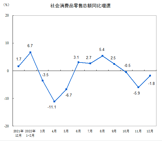 中国 12 月社会消费品零售总额同比增速连续第三个月负增长,但下滑程度较上月大幅放缓,全年社零增速小幅下滑。12 月社会消费品零售总额 40542 亿元,同比下降 1.8%。其中,除汽车以外的消费品零售额 35438 亿元,下降 2.6%。