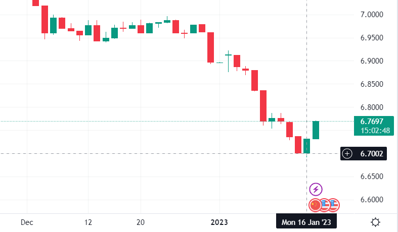 投资者对中国经济复苏恢复信心,人民币汇率延续开年以来的强劲上涨势头,在 1 月 16 日再度刷新半年以来高点,离岸与在岸人民币兑美元自去年 7 月份来首次突破 6.70 关口。伴随市场汇率走高,人民币兑美元汇率中间价节节攀升,报 6.7135,上调 157 点。