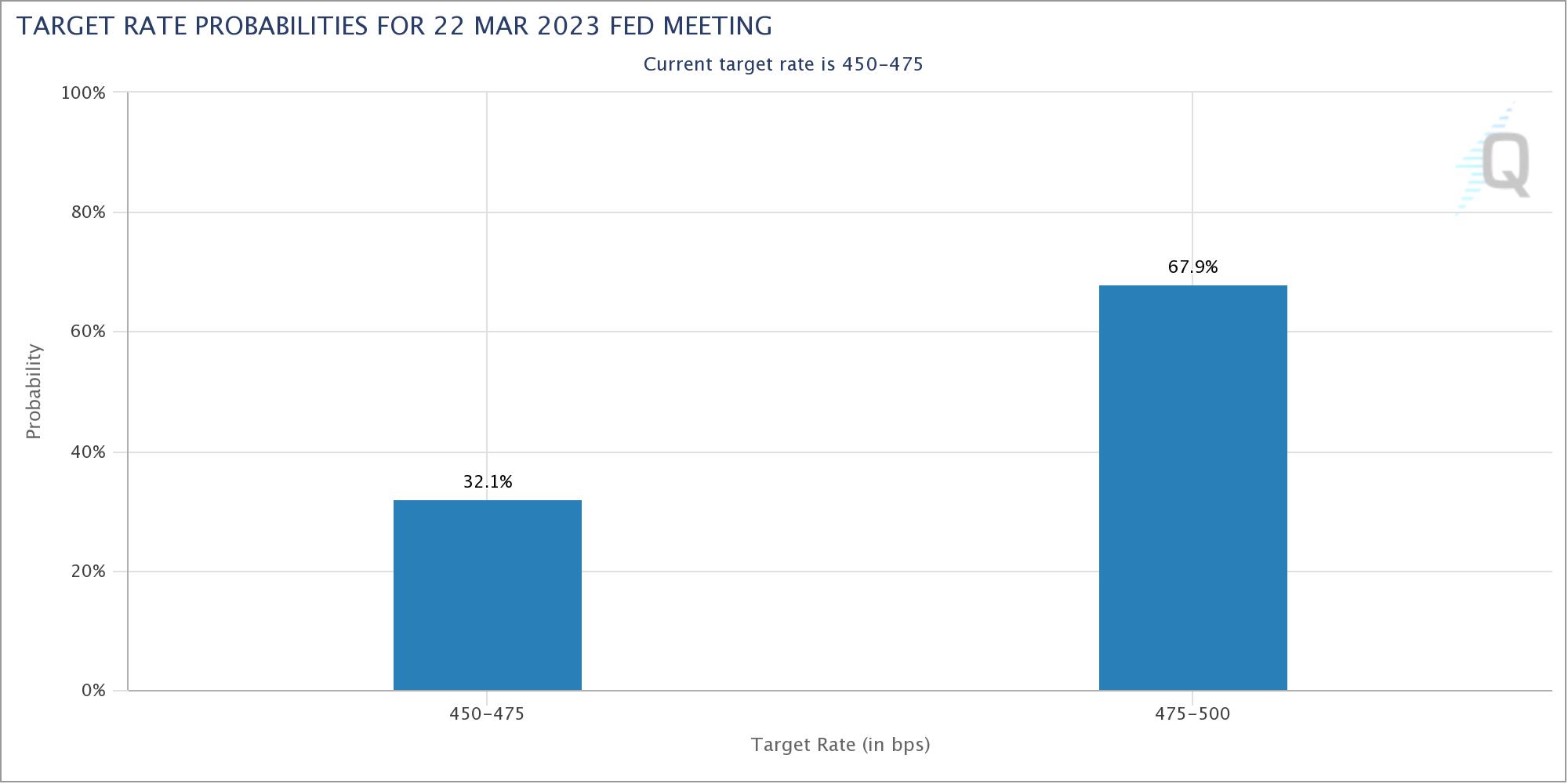 经济数据走软,加上对银行业的担忧日益加剧,美联储在下次会议维持利率不变的理由越来越多。根据“芝商所美联储观察工具( CME FedWatch Tool )”美联储在 3 月的政策会议上不加息的可能性为从昨日的 18.1% 上升到 32.1%,加息 25 个基点的可能性从 81.9% 骤减至 67.9%。