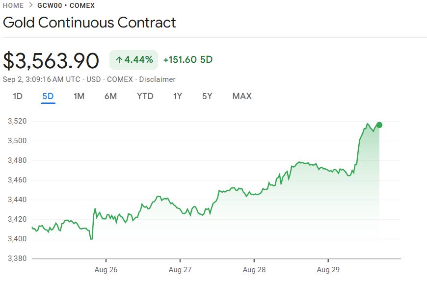 9 月 1 至 2 日,国际金价在经历 4 个多月区间震荡后再度走强。COMEX 黄金期货盘中最高触及 3,557.1 美元/盎司,刷新历史记录。