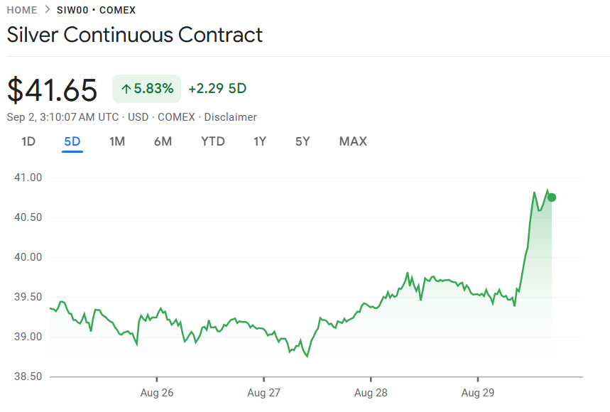 9 月 1 至 2 日,白银价格也迎来强劲上涨,COMEX 白银期货一度触及 41.64 美元/盎司,年内累计涨幅超过 40%。现货白银则突破 40 美元关口,创下自 2011 年以来的新高。