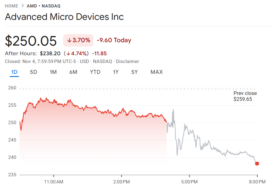 公司在展望中给出优于分析师预估的第四季度营收指引,但利润率指引仅持平市场预期,未能带来惊喜。此外,AMD 表示财测暂未计入若美国放宽芯片出口限制可能带来的潜在利好。受此影响,盘后股价下跌约 3%。