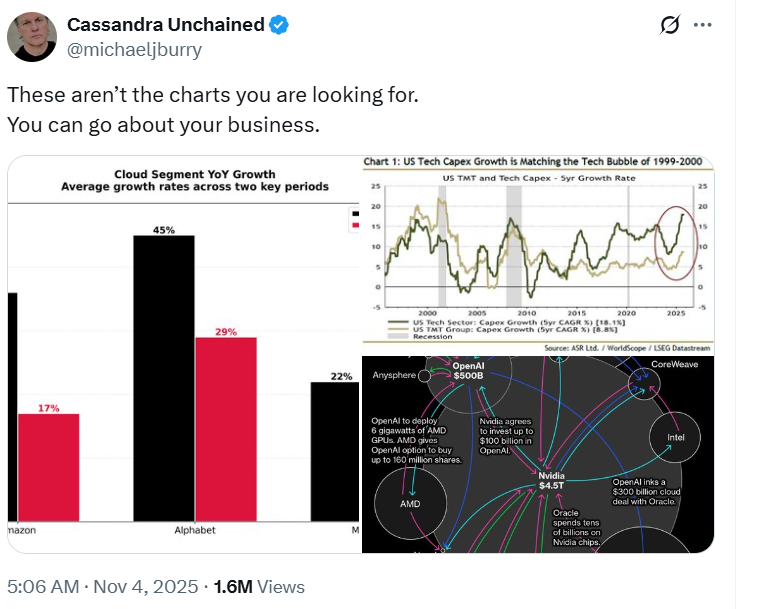 11 月 4 日至 5 日,全球股市周二全面跳水,市场避险情绪急剧升温。电影 “大卖空” 原型人物、对冲基金经理迈克尔·贝瑞(Michael Burry)发出针对 AI 过热的警告,并通过买入英伟达(Nvidia)与帕兰提尔(Palantir)卖权期权,押注相关股票下跌,引发市场恐慌。