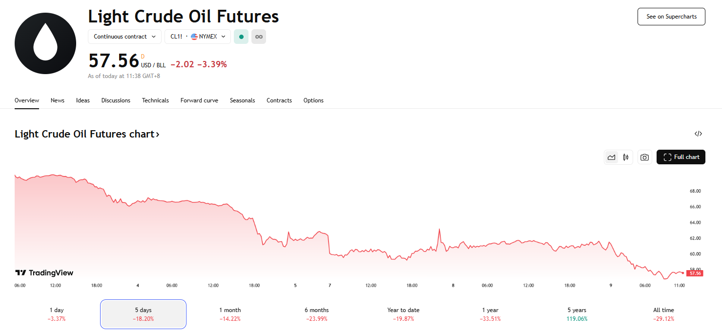 原油价格今年已暴跌近五分之一。由于特朗普的贸易议程削弱了投资者对风险资产的兴趣,石油与其他大宗商品和股票一起下跌,叠加 OPEC+ 决定以比此前预期更快的速度放松供应限制,加剧了油价的跌势。这一系列举措引发了人们对石油供应将超过需求的担忧。
