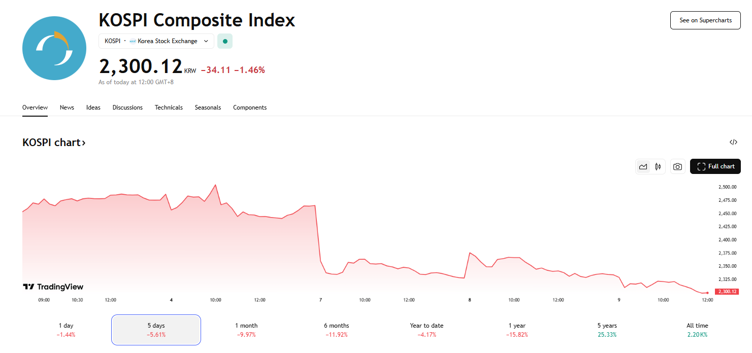 韩国 KOSPI 跌至五年低位,迈入技术性熊市