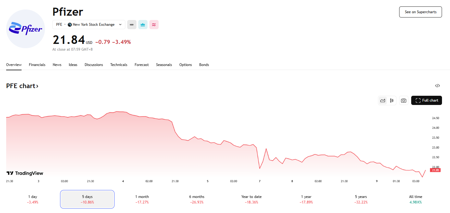 8 日,辉瑞股价下跌 3.5%,收于 21.84 美元,盘中一度触及 21.44 美元的 52 周新低。辉瑞目前市值仅为 1250 亿美元,仅为行业领头羊礼来制药的 20%。