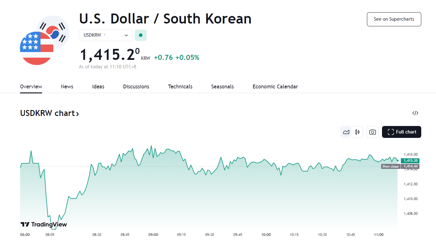 在韩国总统尹锡悦宣布戒严令后,美元兑韩元一度跌至 1443.40 韩元,为 2022年 10 月以来的最低水平。在尹锡悦解除戒严令后,美元兑韩元下跌 1% 至 1,418.35 韩元。