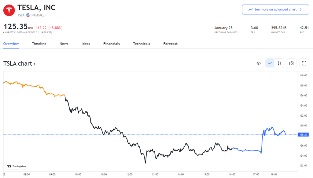 12 月 22 日,特斯拉股价开盘一度跌超 11%,触及 2020 年 9 月以来的最低水平;盘后交易中上涨 2.45%,报 128.30 美元;最终收跌 8.8%,报 125.35 美元。特斯拉的股价仅在 12 月份就已暴跌近 36%,而在 2022 年迄今为止,其跌幅已超过 64%,创 2020 年 9 月份以来的最低水平。