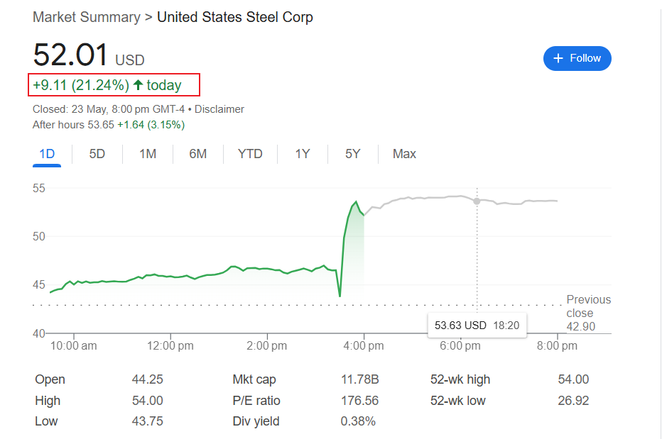 5 月 23 日,特朗普批准美国钢铁(X)与日本新日铁(Nippon Steel)合并,并表示两公司将形成战略合作伙伴关系,为美国创造至少 7 万个就业岗位,带来 140 亿美元经济效益。美国钢铁方面透露,公司总部将继续设在匹兹堡,并将通过合作实现增长,未来四年将迎来大规模投资和新技术应用,创造数千个工作岗位。消息一出,美国钢铁股价周五飙涨逾 20%。