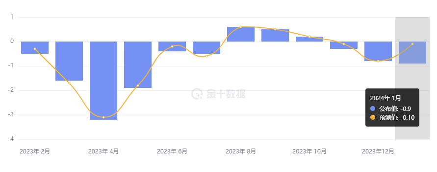 欧盟统计局公布 1 月生产者价格指数(PPI)报告。受能源价格继续下滑的影响,1 月 PPI 同比下降 8.6%,降幅大于预期的下滑 8.1%,虽然降幅较前值下跌 10.6% 有所放缓,但已连续第九个月下滑。1 月 PPI 环比加速下滑至 -0.9%,远超预期的 -0.1%,为 2023 年 5 月以来的最大降幅。