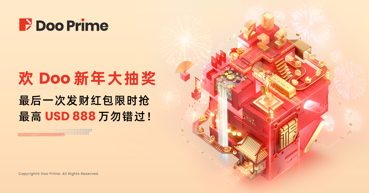 在此之前,Doo Prime 已经开启了共 7 次的限时发财红包,得到了客户的热烈反响!最后一次限时发财红包将于 2023 年 2 月 5 日 00:00-23:59(UTC + 8)元宵节当天准时派发,祝愿全球投资者幸福常伴、心想事成!各位一定要抓住机会抽取最后一批限时发财红包,让您收获一整年的幸福,带给您兔年好运气。希望全球投资者都能收到我们真挚的祝福,新的一年里祝大家交易顺利,财源滚滚。