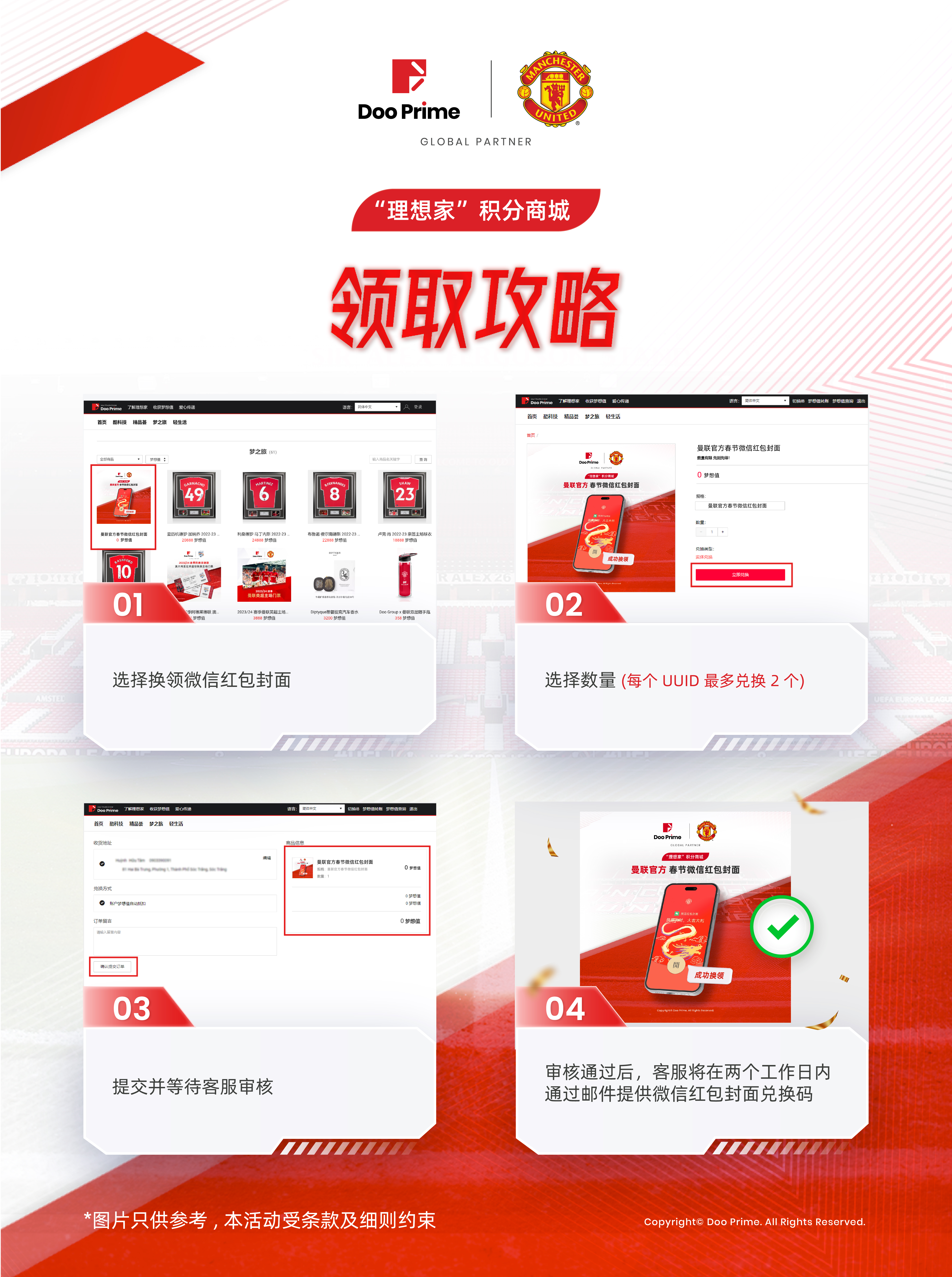 春节福利源源不断!Doo Prime “理想家” 积分商城既为客户提供了丰富多样的新春豪礼外,又一限定福利来袭:即日起,上线曼联官方2024 新春限定微信红包封面!作为曼联官方合作伙伴,Doo Prime 携手曼联为广大客户送上这份特别的新年礼物,以此祝福广大客户新年财源滚滚,交易满盈。