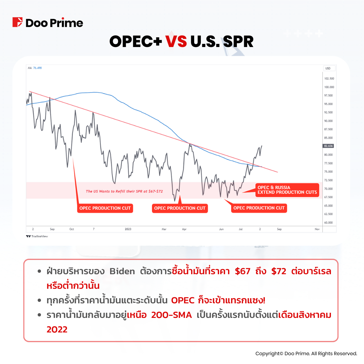 น้ำมัน SPR กำลังหมดลงทุกวัน ราคาน้ำมันที่สูงขึ้นมีส่วนสำคัญต่ออัตราเงินเฟ้อ ซึ่งธนาคารกลางสหรัฐต่อสู้มานานถึง 2 ปีแล้ว หาก OPEC+ และรัสเซียยังคงลดการผลิตน้ำมัน มันจะกดดันให้คลังน้ำมันลดลงและอุปสงค์มีแนวโน้มเพิ่มขึ้น ซึ่งอาจส่งผลให้ราคาน้ำมันสูงขึ้นอย่างมากถึง 90-100 ดอลลาร์สหรัฐฯ ภายในสิ้นปีนี้