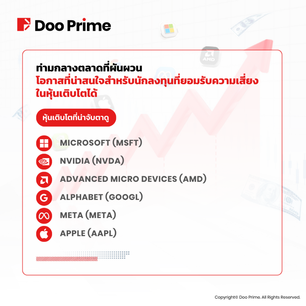 หุ้นเติบโต เช่น Microsoft, NVIDIA, Advanced Micro Devices, Alphabet, Meta และ Apple ครองตำแหน่งทางด้านปัญญาประดิษฐ์ (AI) ที่มีการพัฒนาอย่างรวดเร็ว