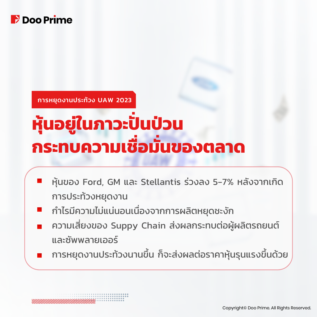 ราคาหุ้นมักสะท้อนถึงความรู้สึกของนักลงทุนและความเชื่อมั่นของตลาด หลังจากการนัดหยุดงาน หุ้นของ Ford, GM และ Stellantis ปรับตัวลดลงในช่วงแรกประมาณ 5-7% นักลงทุนมีความกังวลเกี่ยวกับปัจจัยอยู่หลายประการ: