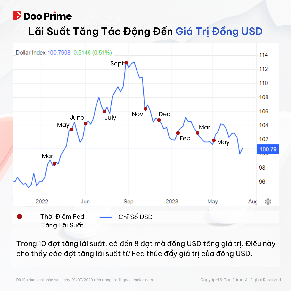 Ngược lại, động thái tăng lãi suất từ Fed sẽ góp phần thúc đẩy sức mạnh của tiền tệ. Lúc này, các nhà đầu tư với mong muốn tìm kiếm mức lợi nhuận cao và ổn định hơn sẽ nhảy vào “cuộc chơi”. Nói đi cũng phải nói lại, mức lãi suất cao hơn có thể khiến việc vay tiền trở nên đắt đỏ hơn, từ đó làm suy giảm mức chi tiêu tiêu dùng và sự tăng trưởng của nền kinh tế. Kết quả là, nhu cầu về tiền tệ nhiều khả năng sẽ giảm, kéo theo sự giảm sút của giá trị các loại tiền tệ.