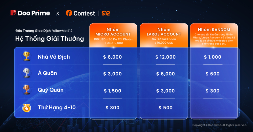 Đặc biệt, những người tạo tài khoản Doo Prime lần đầu thông qua nền tảng FOLLOWME ngay trong khuôn khổ Đấu Trường Giao Dịch FOLLOWME S12 sẽ có cơ hội giành được MacBook Pro, iPhone 14 Pro, iPad mini hoặc các giải thưởng kỹ thuật số 3C hấp dẫn bên cạnh tổng giải thưởng hơn 55,000 USD từ cuộc thi. Chúng tôi rất hy vọng được song hành cùng bạn trên hành trình giao dịch ngay cả trong và sau cuộc thi.