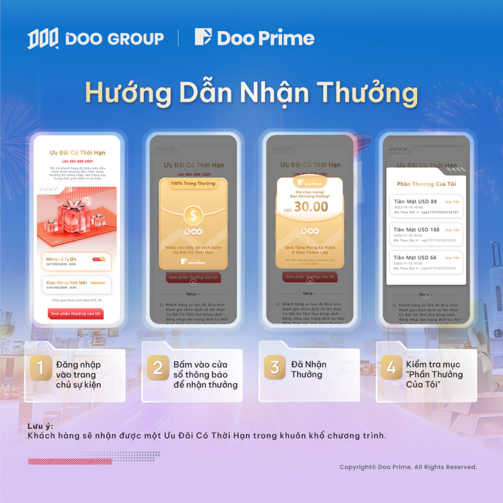 Chiến dịch Ưu Đãi Có Thời Hạn của chúng tôi được tổ chức nhằm đáp lại sự ủng hộ và đồng hành của quý khách hàng toàn cầu trong suốt thời gian qua. Khách hàng đáp ứng điều kiện về số tiền nạp (100 USD) cùng số lô giao dịch quy định (1 lô) với Doo Prime sẽ có cơ hội nhận thưởng Ưu Đãi Có Thời Hạn khi đăng nhập vào trang chủ sự kiện. Và đừng quên, giá trị của mỗi ưu đãi có thể lên đến 888 USD!