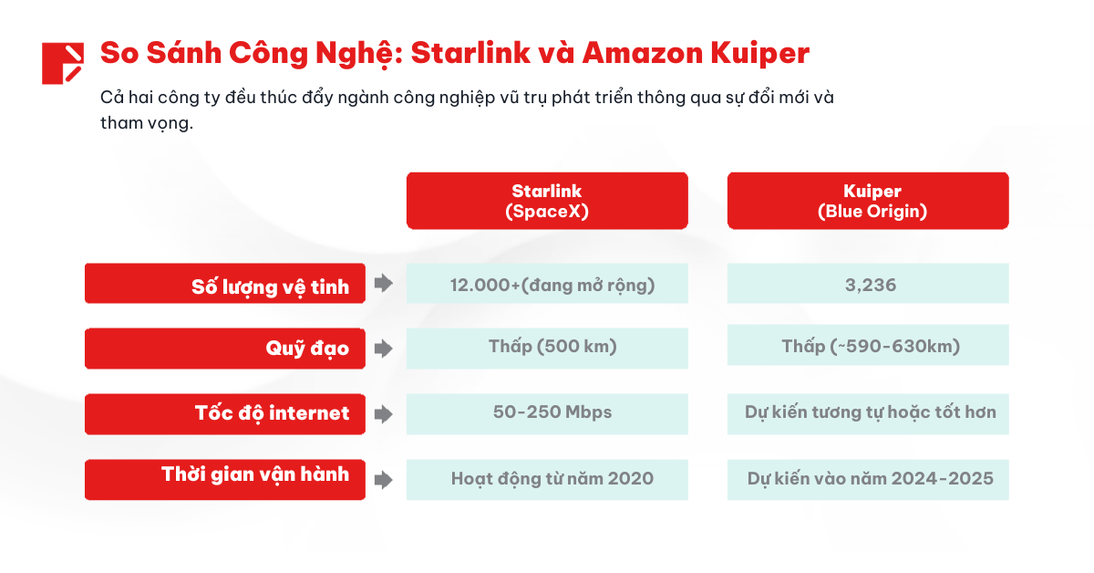 Về mặt công nghệ, cả hai đều tập trung vào việc phát triển tên lửa có thể tái sử dụng đầu phóng để giảm thiểu chi phí. Từ đó, cung cấp dịch vụ internet vệ tinh với độ trễ tốt, chi phí tốt, phủ sóng mọi nơi mà không cần đến cơ sở hạ tầng dây dẫn vật lý.