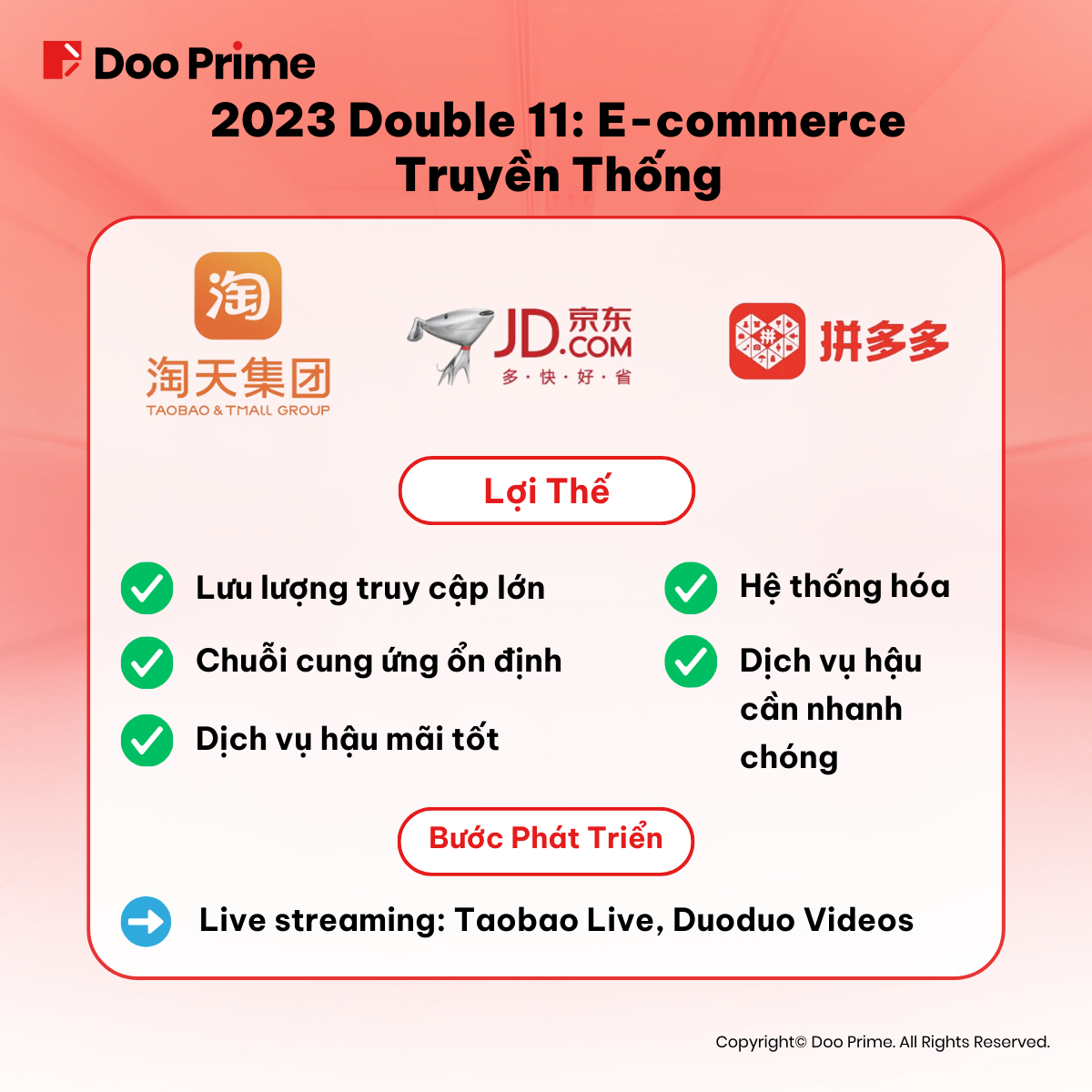 Taobao và JD.com đại diện cho dạng sàn thương mại điện thử truyền thống, với cấu trúc gian hàng, tập trong vào việc cung cấp chủ yếu đa dạng sản phẩm. Taobao tự hào sở hữu chuỗi cung ứng gồm tên thương hiệu, nhãn hiệu riêng, và nhiều cấp độ nhà bán hàng khác nhau. JD.com đã xây dựng mô hình tự vận hành, tập trung và các sản phẩm chất lượng cao dành cho nhóm người tiêu dùng cao cấp.