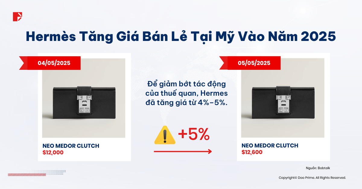 - Hermès, vốn nổi tiếng với vị thế siêu độc quyền, đã tiến hành tăng giá bán lẻ tại Mỹ thêm 4-5% từ ngày 1 tháng 5, bên cạnh mức điều chỉnh hàng năm thông thường là 6-7% nhằm giảm bớt các tác động đến từ mức thuế quan mới.