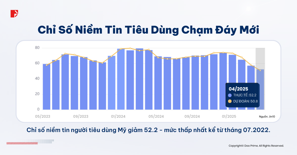 - Chỉ số niềm tin người tiêu dùng Mỹ đã giảm xuống mức 52.2 vào tháng 4 năm 2025 – mức thấp nhất kể từ tháng 7 năm 2022, từ đó báo hiệu sự do dự ngày càng tăng trong việc mua sắm tùy ý của khách hàng.