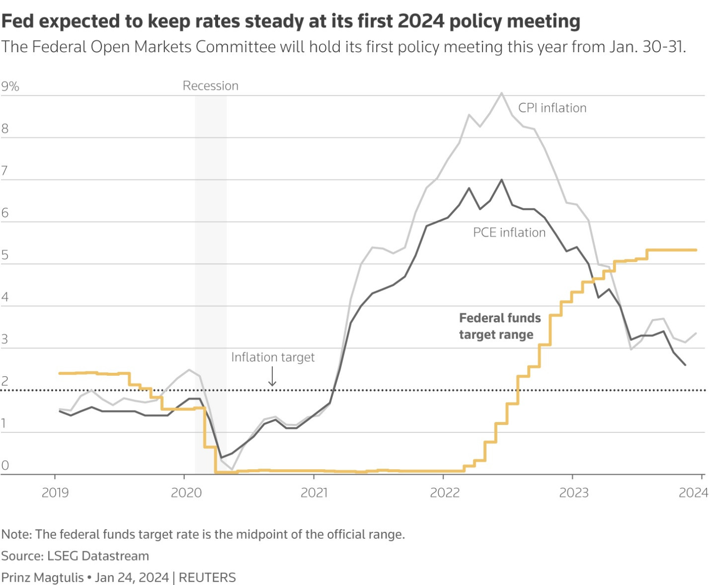 Cục Dự trữ Liên bang Mỹ (Fed) dự kiến sẽ giữ nguyên lãi suất trong cuộc họp diễn ra trong 2 ngày 30-31/1, nơi thị trường tìm kiếm manh mối về thời điểm ngân hàng trung ương hàng đầu thế giới sẽ bắt đầu cắt giảm chi phí đi vay sau một trong những chu kỳ thắt chặt mạnh mẽ nhất trong nhiều thập kỷ.