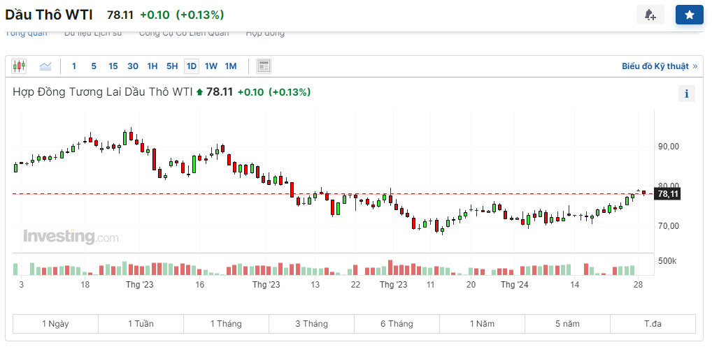 Dầu thô Brent kỳ hạn tăng 26 cent, tương đương 0,3%, lên 83,81 USD/thùng vào lúc 07:40 GMT sau khi chạm mức cao nhất trong phiên là 84,80 USD. Hợp đồng tương lai dầu thô WTI của Mỹ tăng 23 cent, tương đương 0,3%, lên 78,24 USD/thùng sau khi đạt mức cao nhất trong ngày là 79,29 USD trước đó trong phiên.