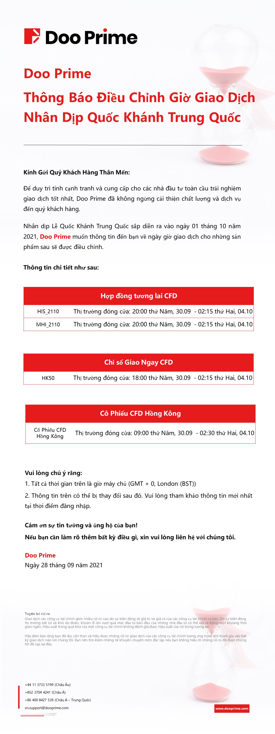 2021-09-28 | Điều chỉnh Giờ Giao Dịch , Giờ Nghỉ Lễ